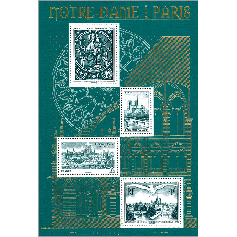 パリのノートルダム大聖堂関連の過去のフランス切手をもとにした図案の4種を収める。もととなった切手は1947年発行の「パリUPU会議」切手ほか。