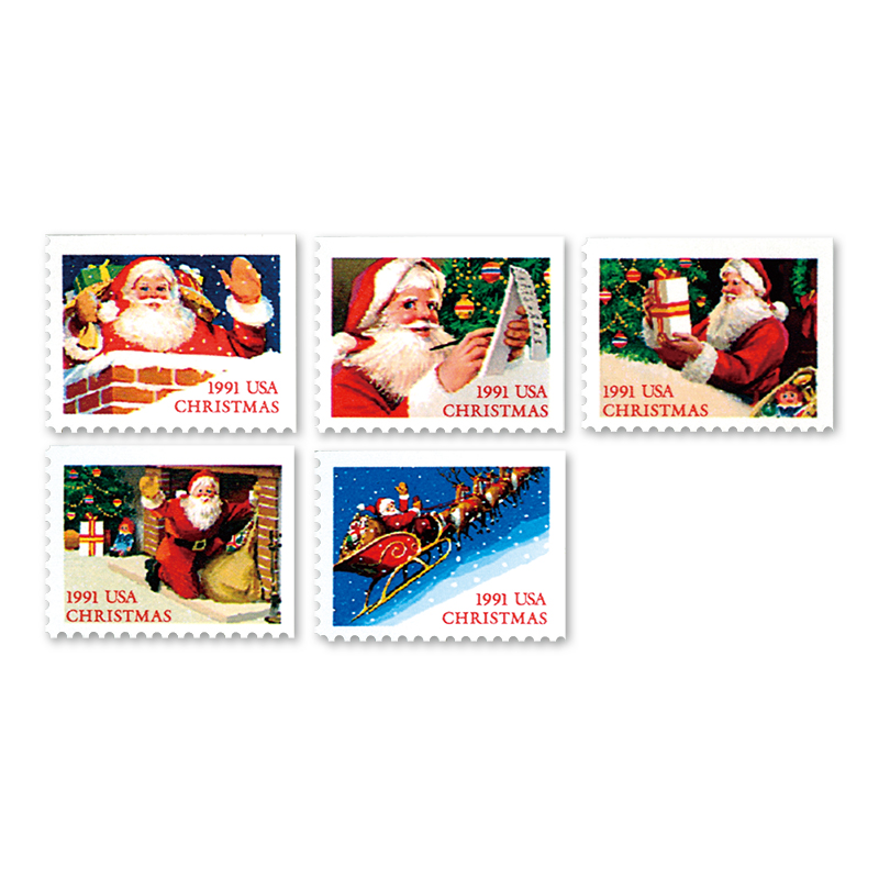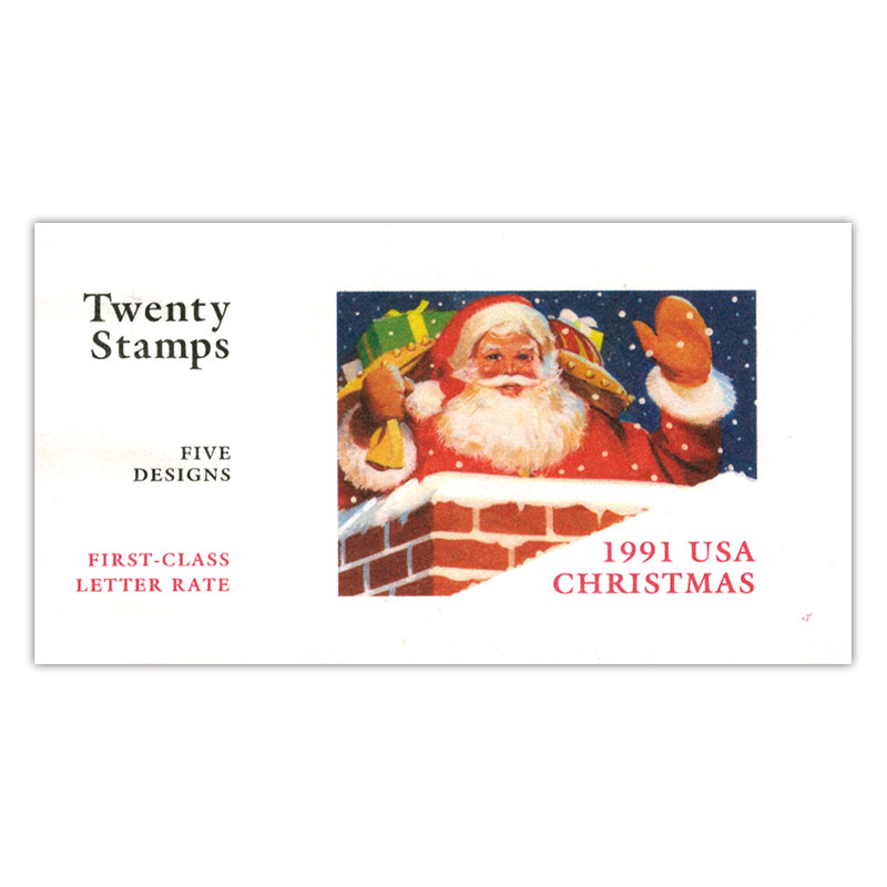 煙突から入るサンタクロース、そりに乗るサンタクロースほかを描く切手を収めるペーン5種を綴じる切手帳。5種のペーンのうち1種は、タイプTとUの2種類が存在する単片を各2枚計4枚収めるペーンで、タイプTとUは、印面左端の煙突上部の煉瓦が見えるか見えないかの違い。