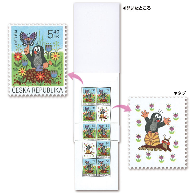 切手8枚とタブ2枚からなる10面ペーン1枚を収める。