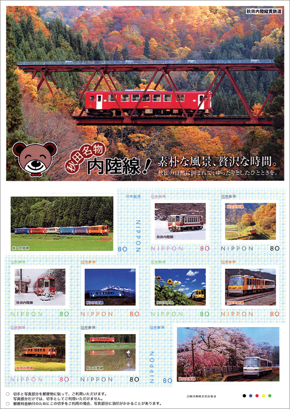 秋田県を縦断する「秋田内陸線」の沿線には広大なみどりの世界がひろがります。季節ごとに鮮やかに染まる大自然は、折々の風情を醸しだし、旅人を暖かく迎えてくれます。緑の大地に純朴な人情がとけ込んでいる沿線。ここだけは時間がゆっくりと流れているようです。本フレーム切手は四季折々の大自然の中を走る「秋田内陸線」をデザインしています。