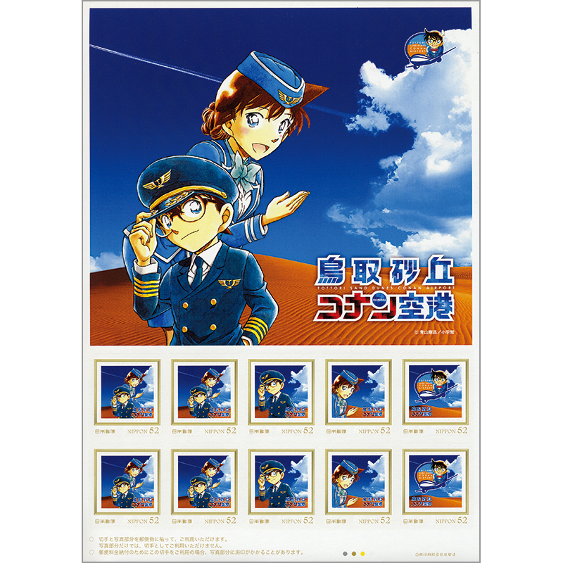 「鳥取砂丘コナン空港」愛称化のために青山剛昌先生が書き下ろしたメインビジュアルと鳥取砂丘コナン空港のマーク及びロゴを題材にしたフレーム切手です。