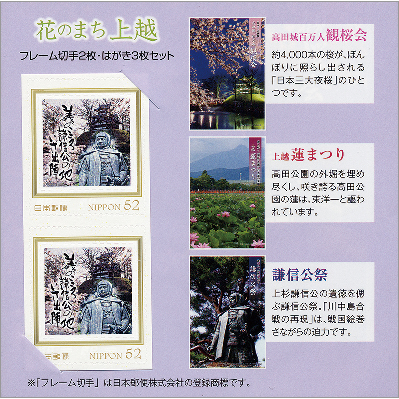 上杉謙信公をデザインした切手と、日本三大夜桜で有名な“高田城百万人観桜会”、東洋一と謳われている“上越蓮まつり” 、上杉謙信公の遺徳を偲ぶ“祭” をモチーフにした絵入りはがき3枚の限定セットです