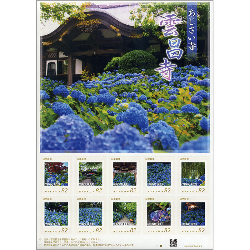 「アジサイ寺」として人気を集める雲昌寺(うんしょうじ)をテーマにしたオリジナルフレーム切手。本堂をバックに咲き誇るアジサイの花や夕方の境内の様子など10種類の写真を題材にしています。