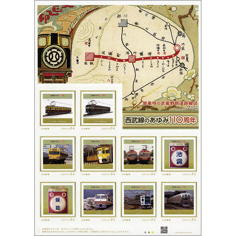西武鉄道創立110周年を記念。シート地には開業時の武蔵野鉄道路線図がデザインされており、切手には新旧車両の写真などが収められています。