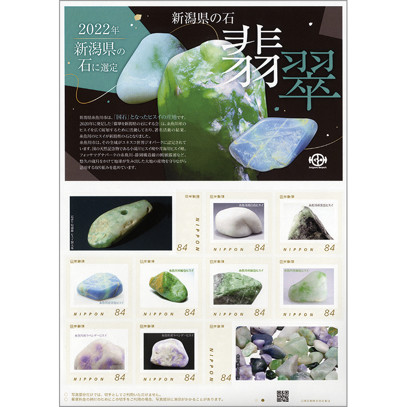 国内最大の宝石「翡翠」産地がある新潟県糸魚川市。宝石「翡翠」が令和4年11月4日に新潟県の石として認定されたことを記念し、美しい翡翠をデザインしたフレーム切手を作成しました。