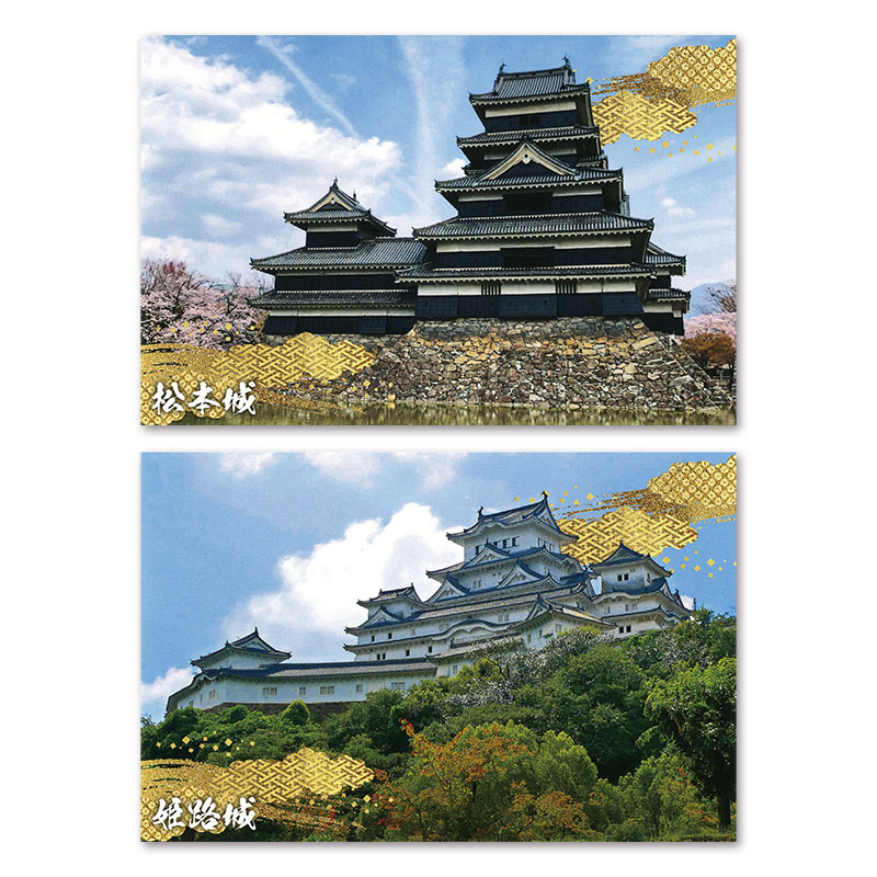 シート地はステッカーになっていて、12城の姿が楽しめます。大型ポストカード台紙が2枚にはそれぞれ、松本城、姫路城。
