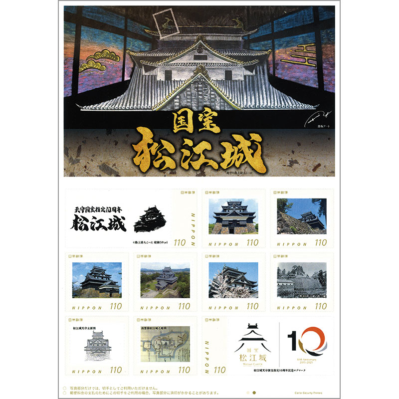 シート地には、松江市内の郵便局社員が黒板にチョークで描いた松江城と地元出身のアーティスト「路上詩人こーた」さんが書いた「国宝松江城」の字が大きく描かれています。