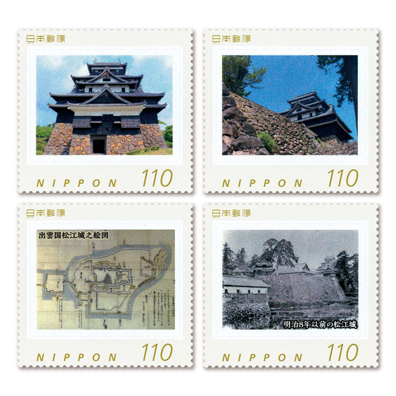 切手には、明治時代以前に撮影された松江城や、満開の桜と撮影された松江城の写真のほか、昔の絵図や松江市を拠点に活動しているアーティストが描いた城の絵などが選ばれています。