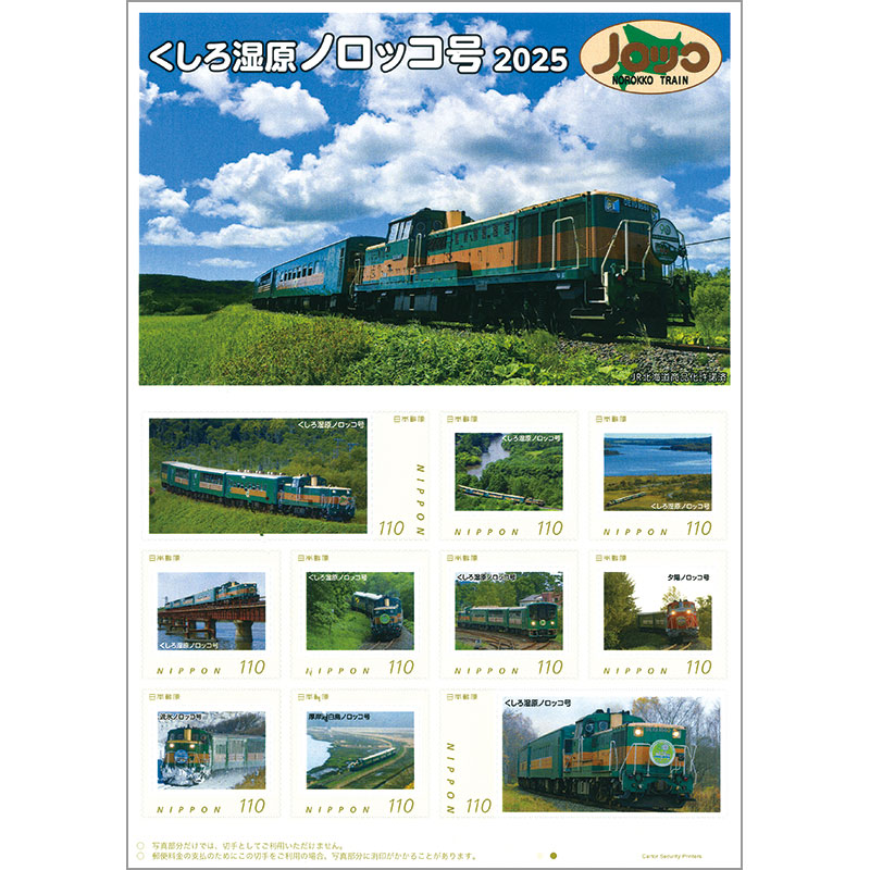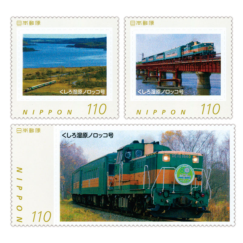 切手には、雄大な湿原を走行する「くしろ湿原ノロッコ号」や「夕陽ノロッコ号」、「流氷ノロッコ号」の写真が収められています。