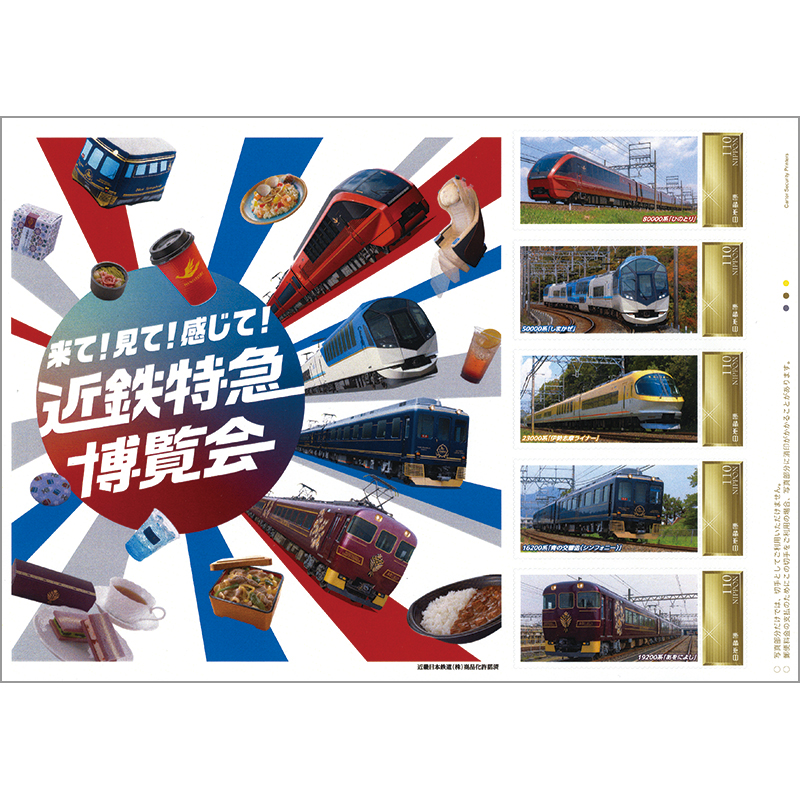 シート地や切手には、80000系「ひのとり」、50000系「しまかぜ」、23000系「伊勢志摩ライナー」、16200系「青の交響曲」、19200系「あをによし」の5車体が採用されています。