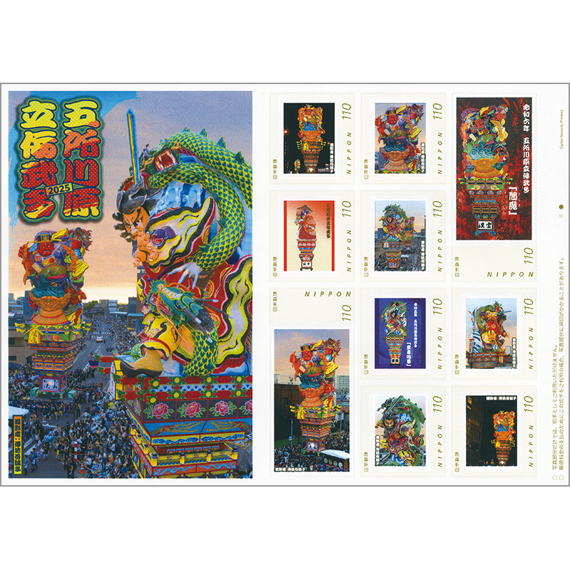 青森県五所川原市で8月4日から8月8日に開催される五所川原立佞武多。青森三大佞武多の一つで、高さが最大で約23mの山車の壮大な運行が魅力です。一台一台がテーマを持ち、それを表現するために細かな造形と鮮やかな色使いが施されています。切手には、昨年登場した「閻魔(えんま)」や2023年の「素戔嗚尊(すさのおのみこと)」など歴代の大型立佞武多の写真や原画をあしらいました。