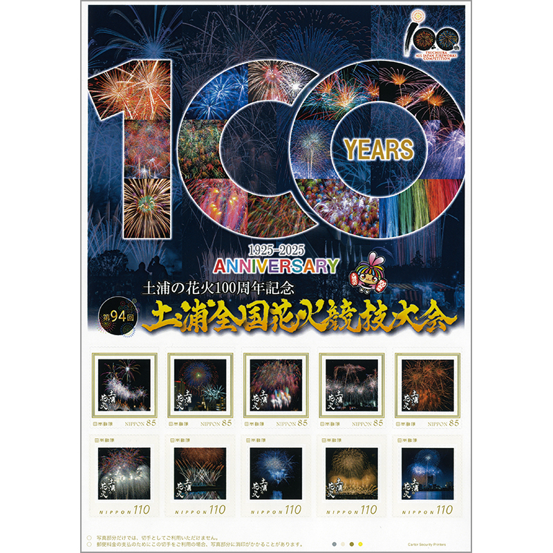 大会100周年を象徴する「100」の文字内に土浦の花火フォトコンテストの歴代入賞作品を散りばめ、大会の歴史を振り返りながら、100周年を祝う華やかなデザインになっています。