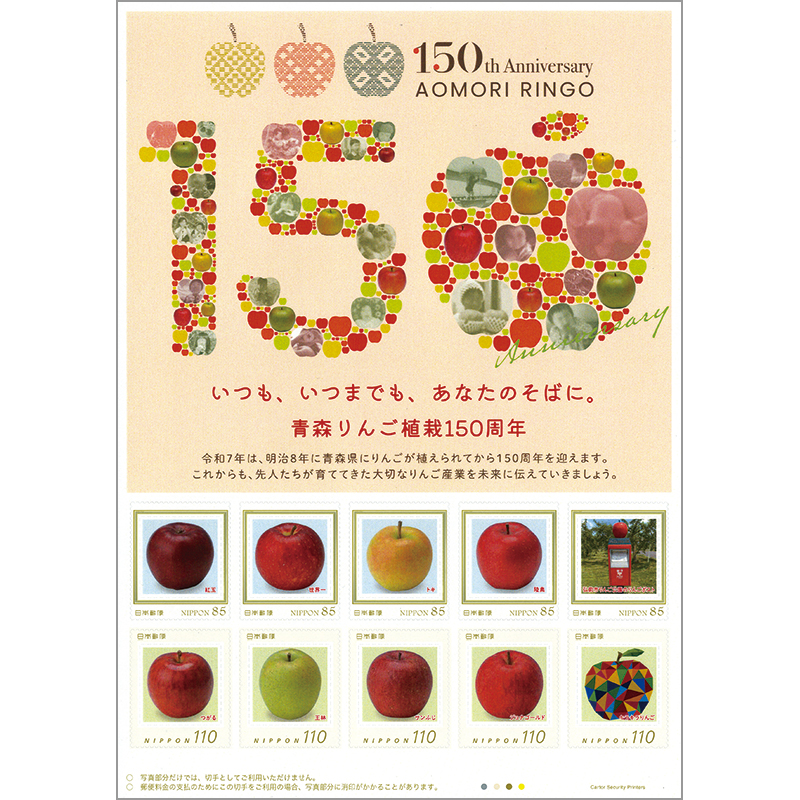切手には県内で生産されている主力品種「サンふじ」「王林」「つがる」「ジョナゴールド」のほか、本県で生まれた「世界一」「トキ」など8品種、弘前市りんご公園のリンゴポスト、SDGsカラーの「キラキラりんご」がデザインされています。