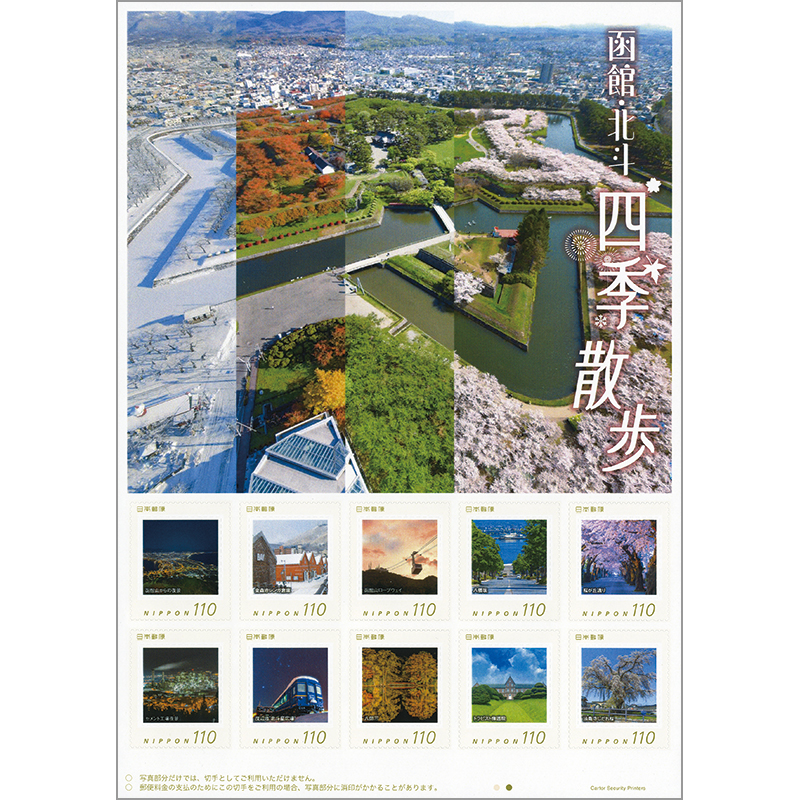 函館市は五稜郭公園の四季の表情がシート地にデザインされており、切手には春の桜が丘通り、夏の八幡坂、秋の函館山ロープウェイ、冬の赤レンガ倉庫と函館山からの夜景。