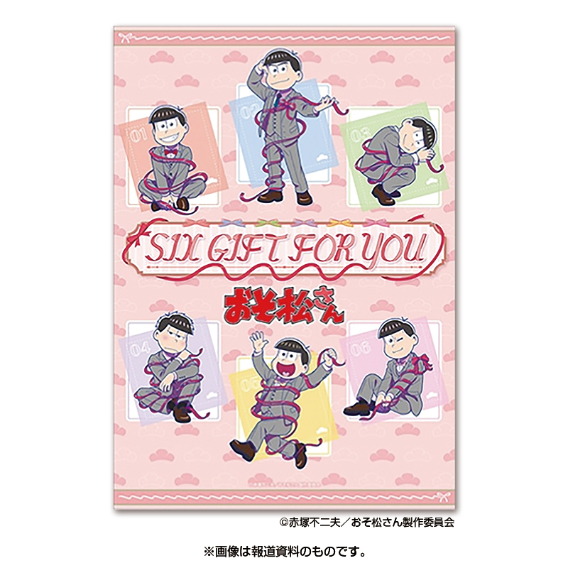 「SIX GIFT FOR YOU」シリーズは、グレーのスーツにピンクのリボンが巻かれた、まるでプレゼントのような6つ子たちの姿が描かれた特別な描き下ろしイラストが登場。