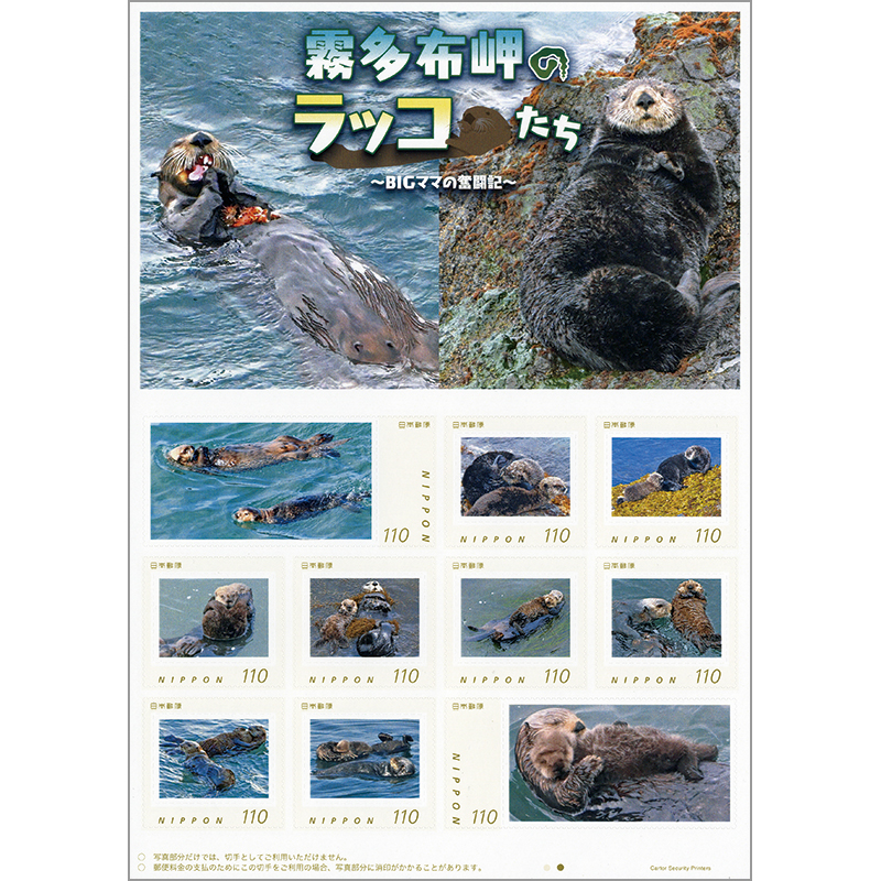 北海道浜中町の霧多布岬周辺に生息する野生のラッコの親子を捉えたフレーム切手の第3弾。