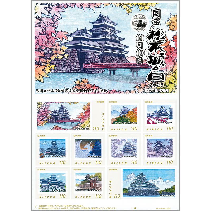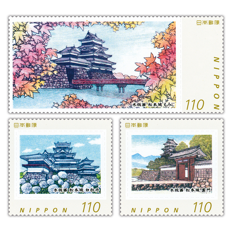 地元の木版画家・塩入久氏が、国宝・松本城をさまざまな角度からの天守に桜やボタン、モミジで彩りを添え、雪景色も交えて四季の移ろいを表現しています。また、第3弾の切手に用いられたモノクロ作品をカラー化したものです。