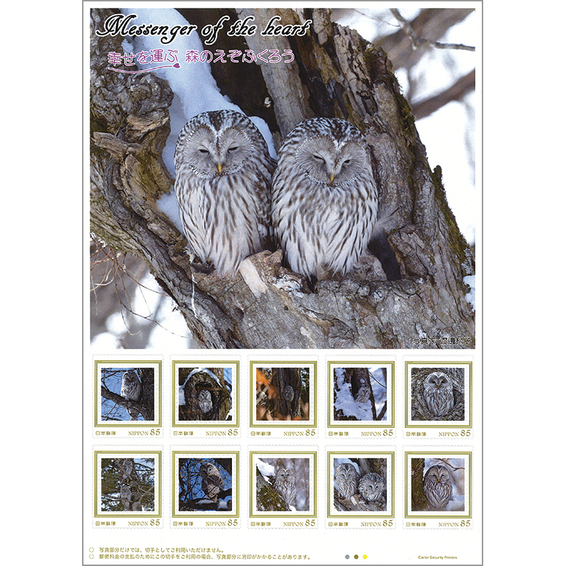 秋から冬にかけての北海道で、顔の輪郭がハート形に見えるかわいらしいエゾフクロウの様々な姿を正面からとらえた愛らしい切手になっています。