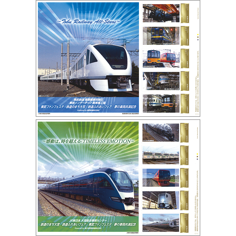 記念切手セットは2シート構成で、切手やシートには、JR東日本のE261系「サフィール踊り子」やD51形蒸気機関車(SL)、185系、253系、E259系電車、カシオペアのほか、東武鉄道N100系「スペーシア X」やC11形123号機、8000系フライング東上カラー、50050系とJR253系の並び、8111FとTJライナーなどの車両写真を使用。