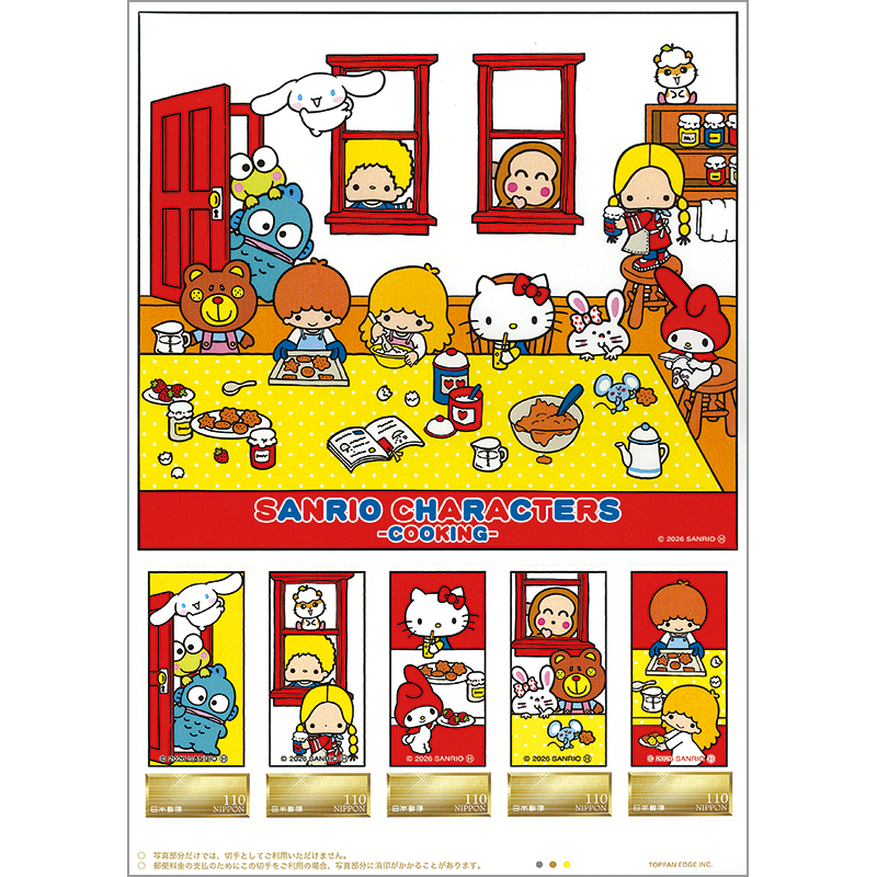 サンリオのキャラクターたちが、みんなでクッキングを楽しむ様子が描かれています。