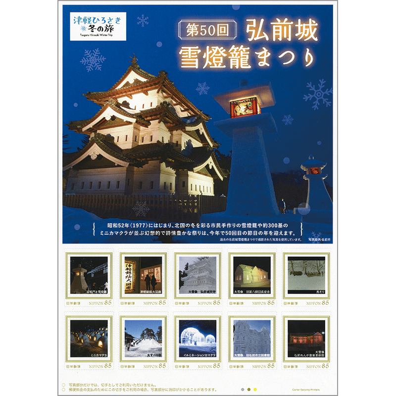 50回目の節目を迎える弘前城雪燈籠まつりを記念。祭りを代表する雪燈籠や過去の大雪像、幻想的なミニカマクラ、かつて祭りの一部として行われていたという馬そりなどがデザインされています。