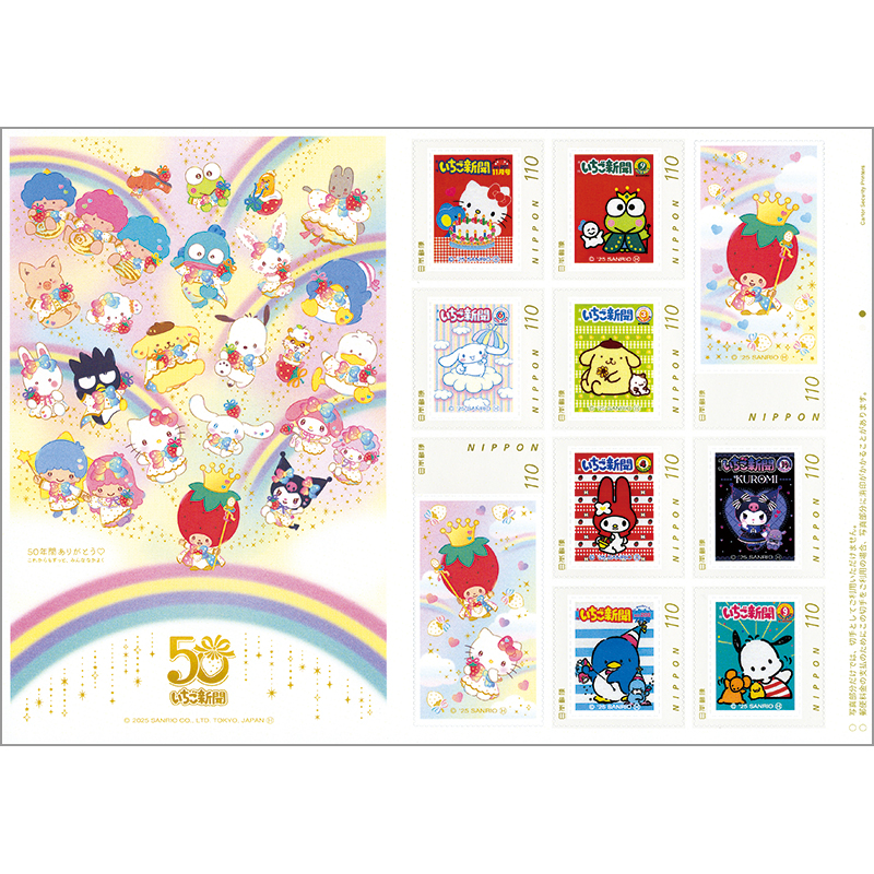 切手のデザインは、人気のキャラクターが表紙を飾るいちご新聞の歴代表紙の中から厳選。お部屋に飾って使用いただけるよう、50周年記念アートを全面に使用したデザインになっています。