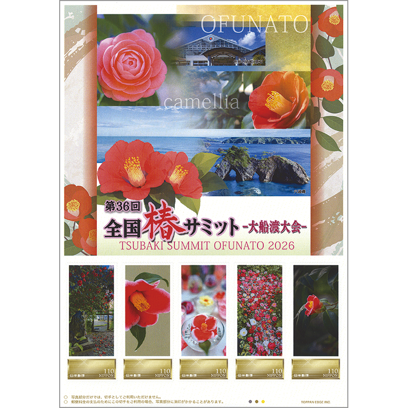 大船渡市での開催は平成12年以来26年ぶりとなり、切手には、椿まつりに合わせて実施したフォトコンテストの入賞作品が収められています。