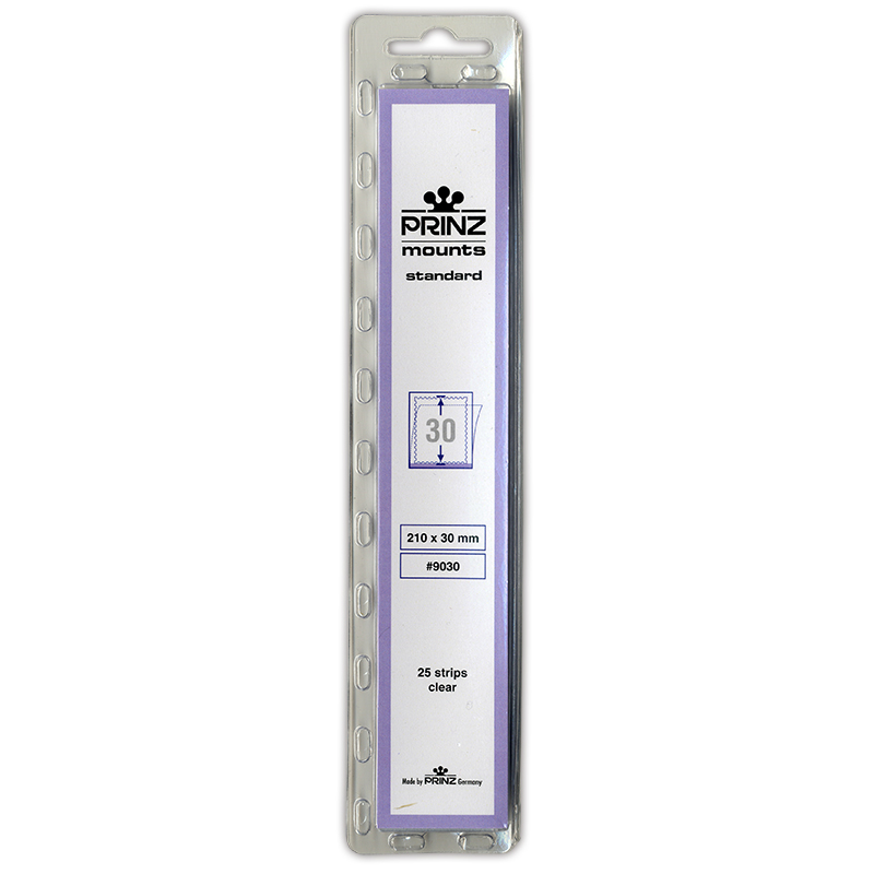 ヨコ210×タテ30ミリ(商品表記サイズ)、透明地25枚入り。最大タテ30ミリの切手用。下辺がシールされた上開きタイプ、スチロール樹脂製。切手の横幅に合わせて裁断し使用する、横に細長い形状(ストリップ)。