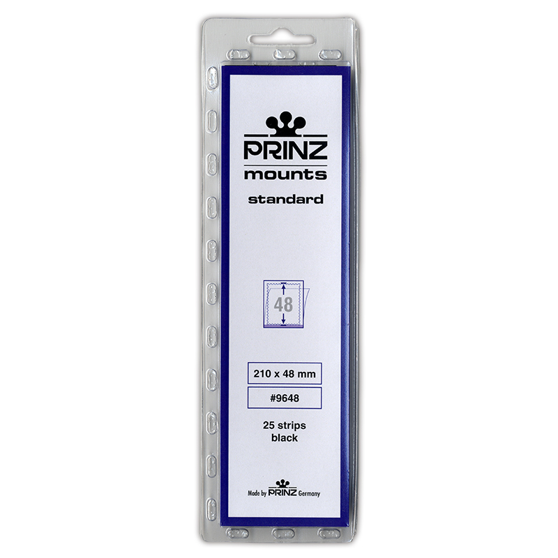 ヨコ210×タテ48ミリ(商品表記サイズ)、黒地25枚入り。最大タテ48ミリの切手用。下辺がシールされた上開きタイプ、スチロール樹脂製。切手の横幅に合わせて裁断し使用する、横に細長い形状(ストリップ)。