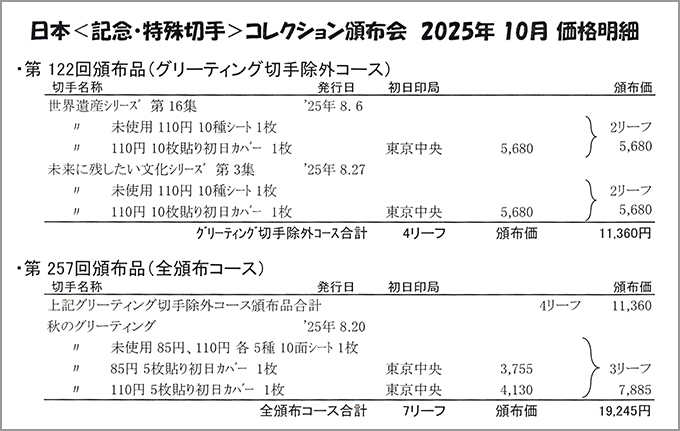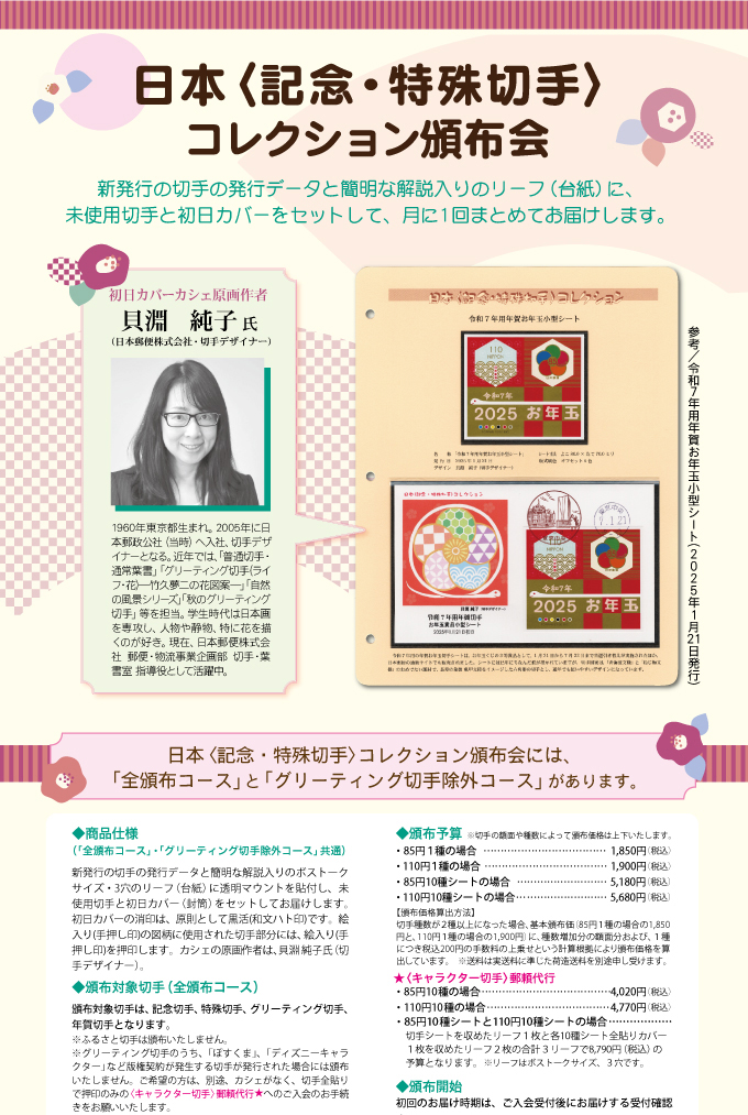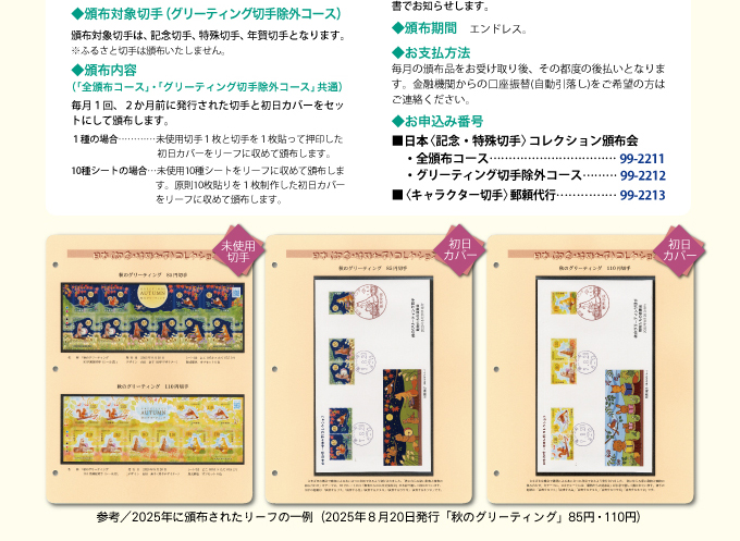 新発行の切手の発行データと簡明な解説入りのリーフ(台紙)に、未使用切手と初日カバーをセットして、月1回まとめてお届けします。