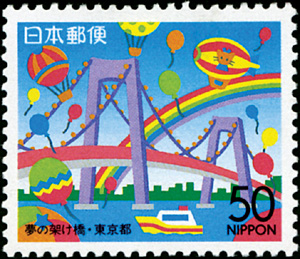 この切手のモチーフは、今や東京臨海副都心のシンボルとなった「レインボーブリッジ」です。
